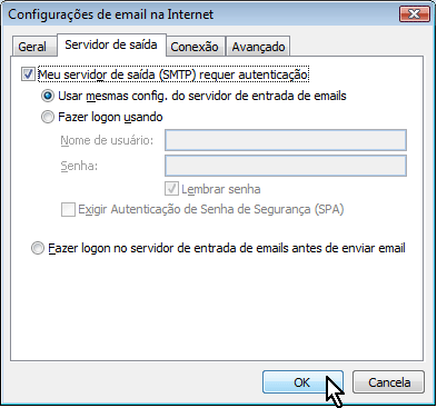 Ainda na janela de "Configurações de email na Internet", altere o número da porta do servidor de Emails de saída (SMTP) de "25" para "587" e, clique em "OK".
