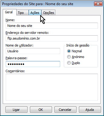 Na janela "Propriedades do site", preencha os campos conforme as instruções abaixo: